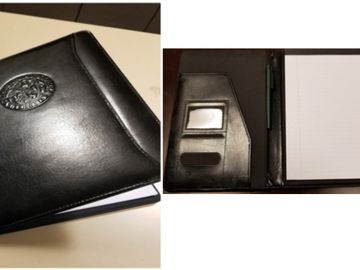 The PHS pad folio is perfect for taking to interviews, conferences, and presentations. It’s very sleek and professional! Overall dimensions are 9 ½” W x 12 1/8” H x ¾” D. Embossed logo is 3 ½” W.