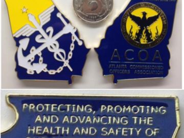 The coin is 2.25" tall and made in the shape of Georgia (The quarter provides a sense of the size). One side of the coin features the new ACOA logo, while the other includes a seal with a phoenix rising from the flames (symbolizing the revitalization of Atlanta after if was nearly burned to the ground during the Civil War), the names of the agencies in the Atlanta metro area to which ACOA members are assigned, the Commissioned Corps mission and the year that ACOA was founded.